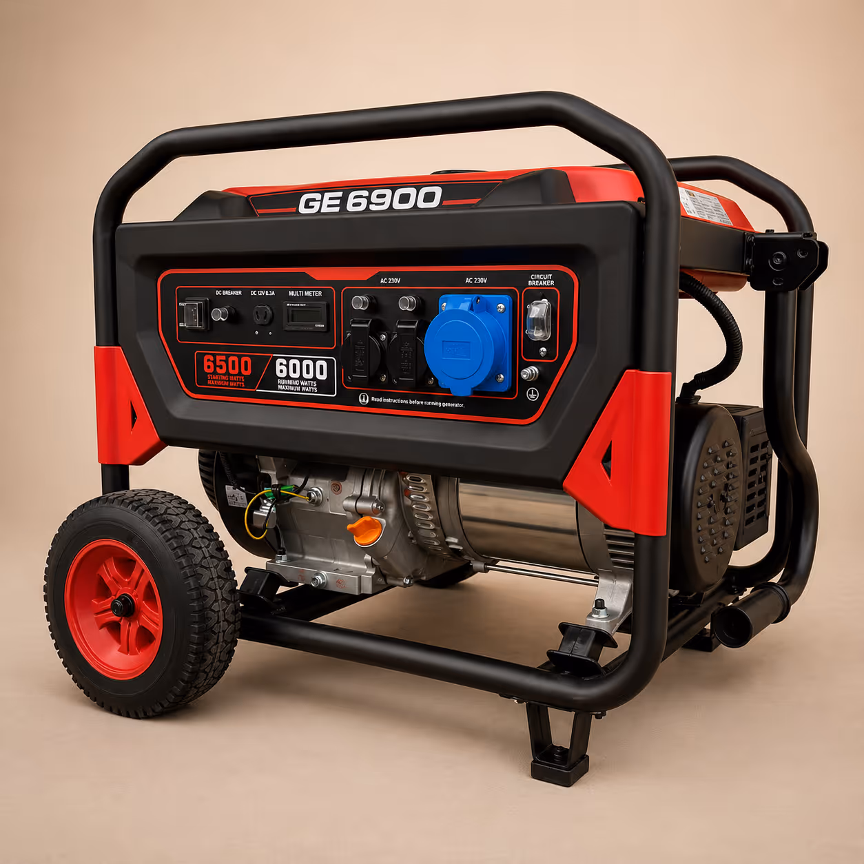 Бензиновий генератор MOSA GE 6900 — потужне однофазне рішення для резервного електроживлення будинку, дачі, майстерні, гаража або виїзних робіт. Модель поєднує портативний формат, ручний запуск, AVR-стабілізацію, повітряне охолодження, шумоізольоване виконання та автономну роботу до 10 годин при 50% навантаженні. Генератор оснащений колесами та ручкою для зручного переміщення, має розетки 230 В і вихід 12 В для заряджання.